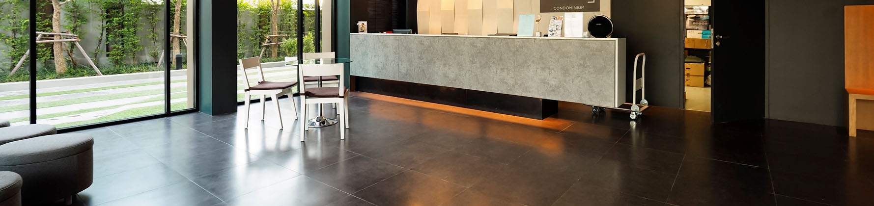 また、ヒールマークや汚れが付き難く、付いても簡単に落とせる点、被膜の損傷がない点など、日常清掃の大幅な簡素化が図れ、維持管理費の大幅削減が可能となります。 -
